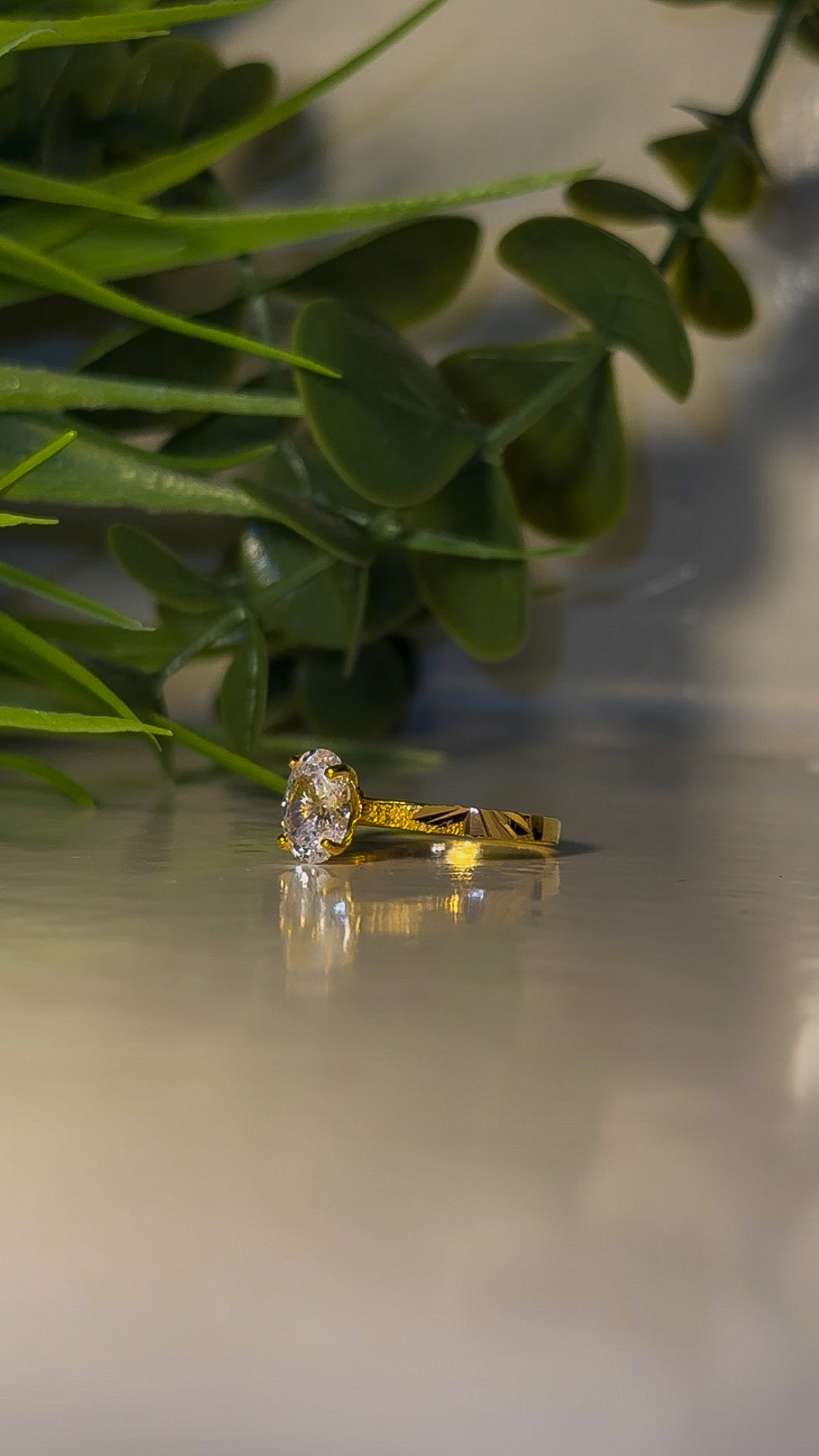 Classic beauty meets artisanal brilliance in the “Tali” Ring—a stunning piece crafted in rich 22ct gold and designed to captivate from every angle. At its centre lies a graceful oval-cut stone, perfectly complemented by intricate diamond-cut detailing along the sides, catching the light with every movement.
